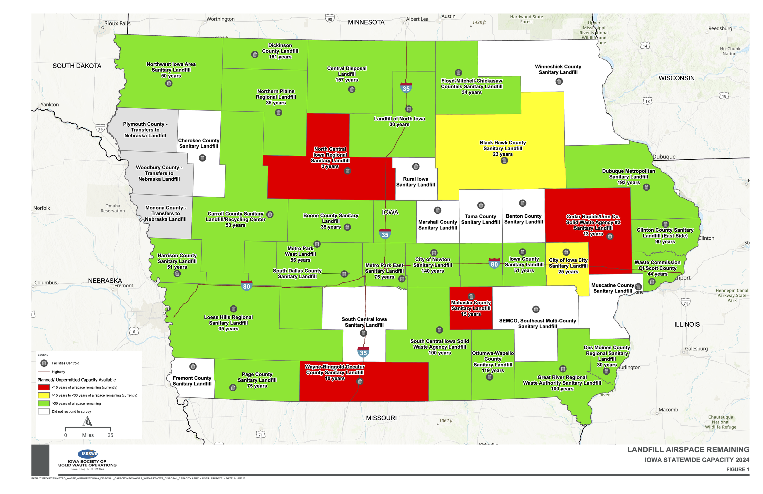 The Iowa statewide landfill capacity study was undertaken by the ISOSWO Technical Advisory Committee (TAC) in 2025 with the intent to understand landfill capacity at active sites throughout the state and to identify where conversations may be needed manage future waste volumes in an intentional and proactive manner.